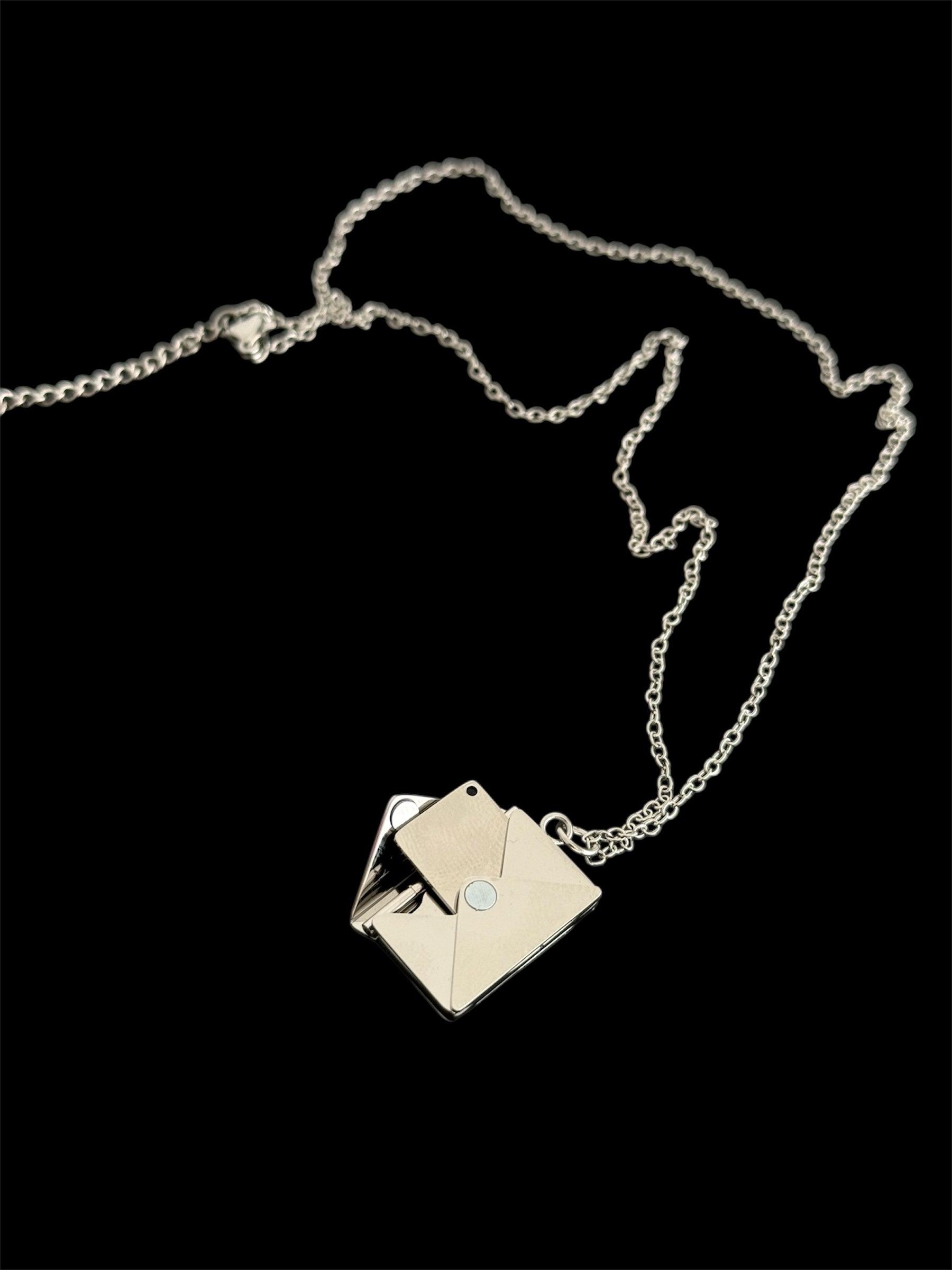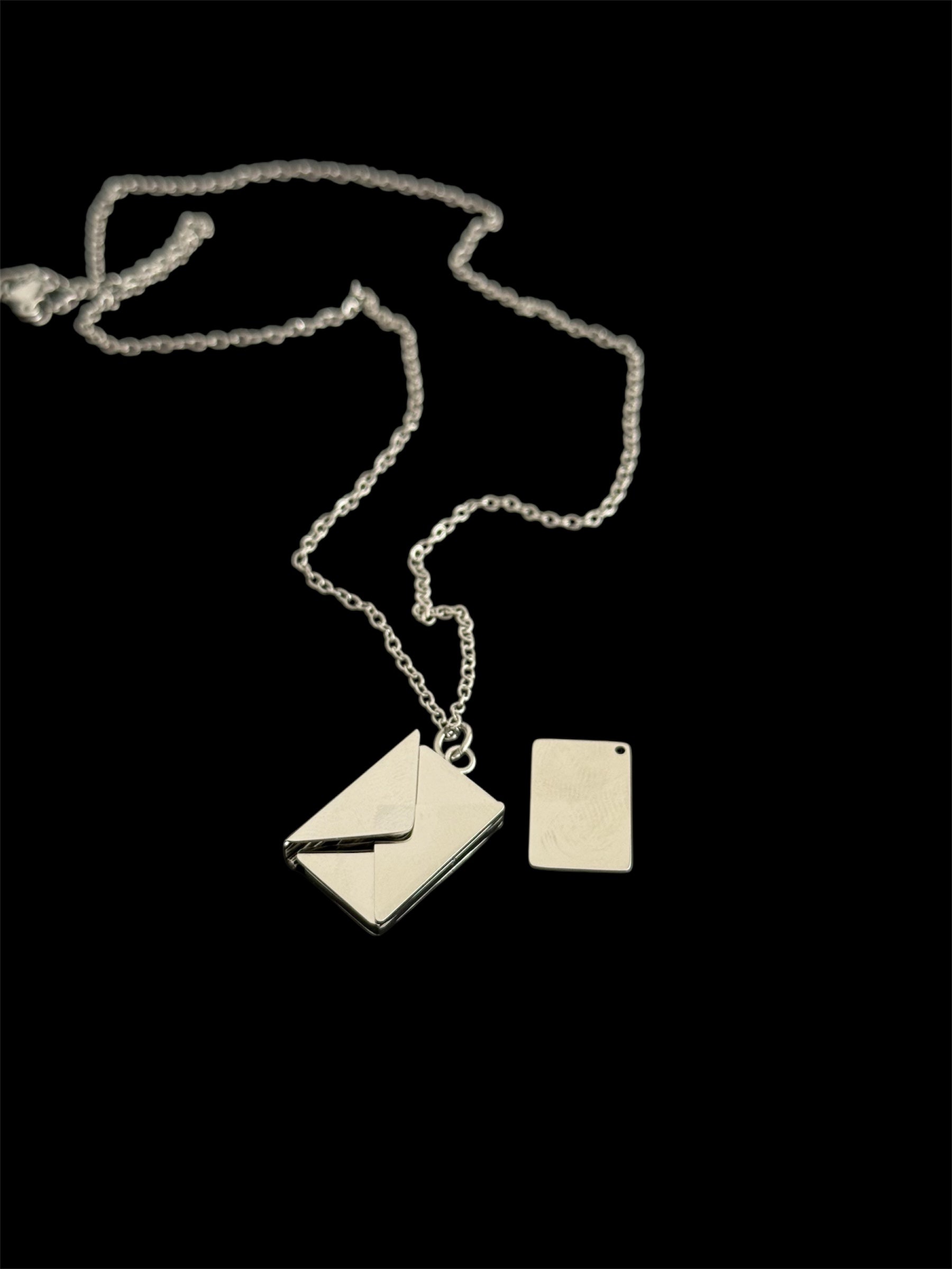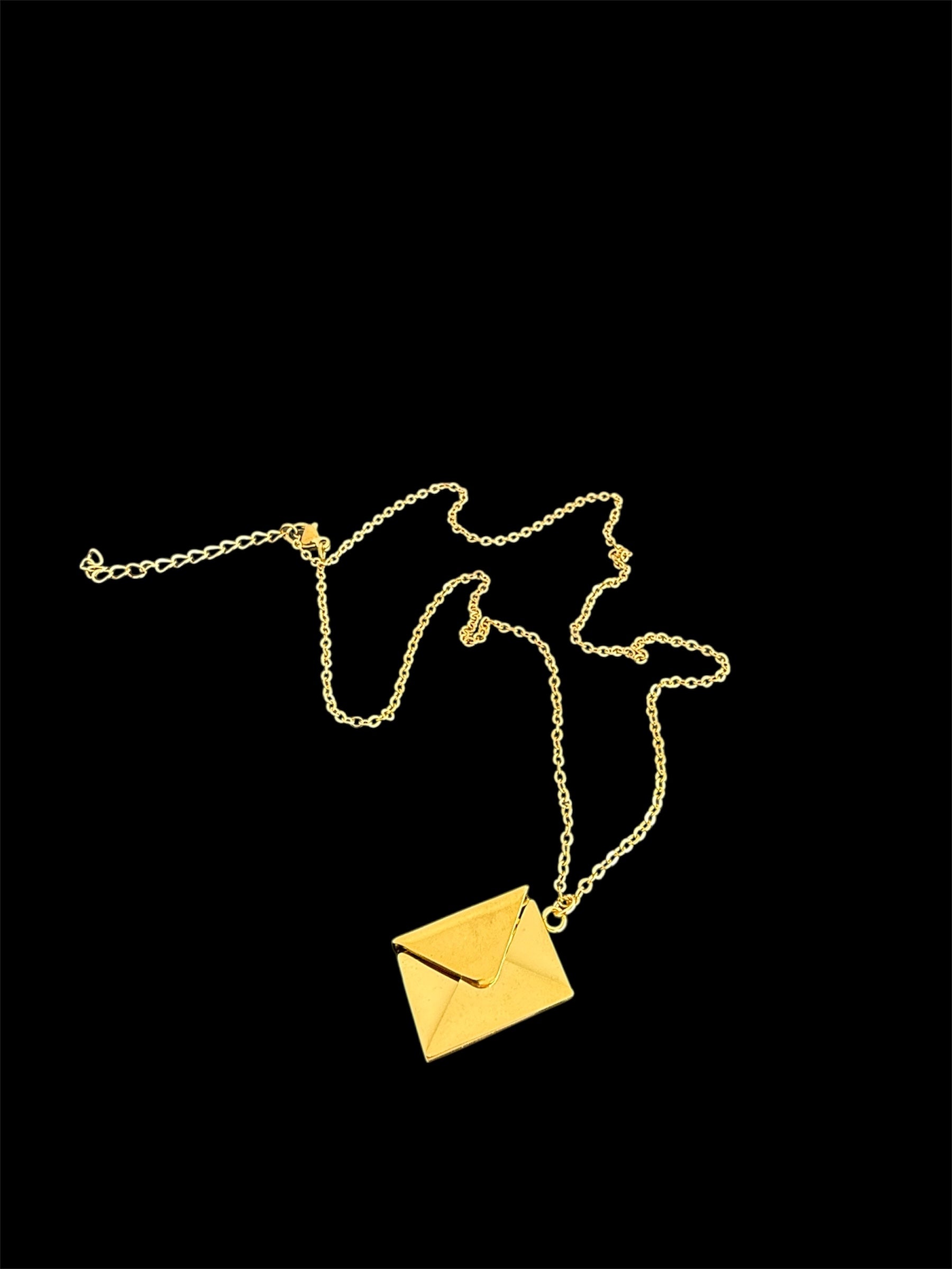 Collar de acero inoxidable dorado o plateado con dije en forma de sobre.
