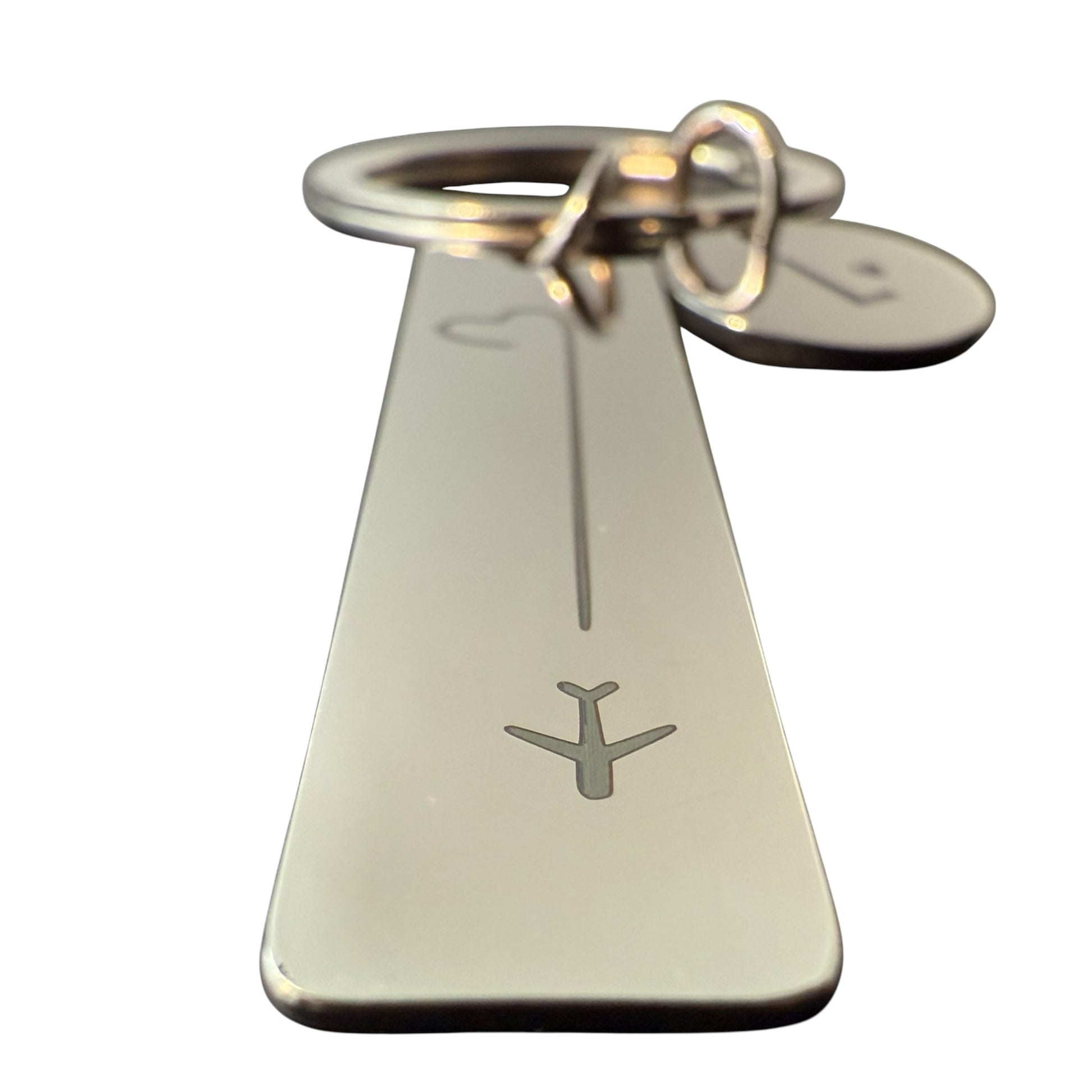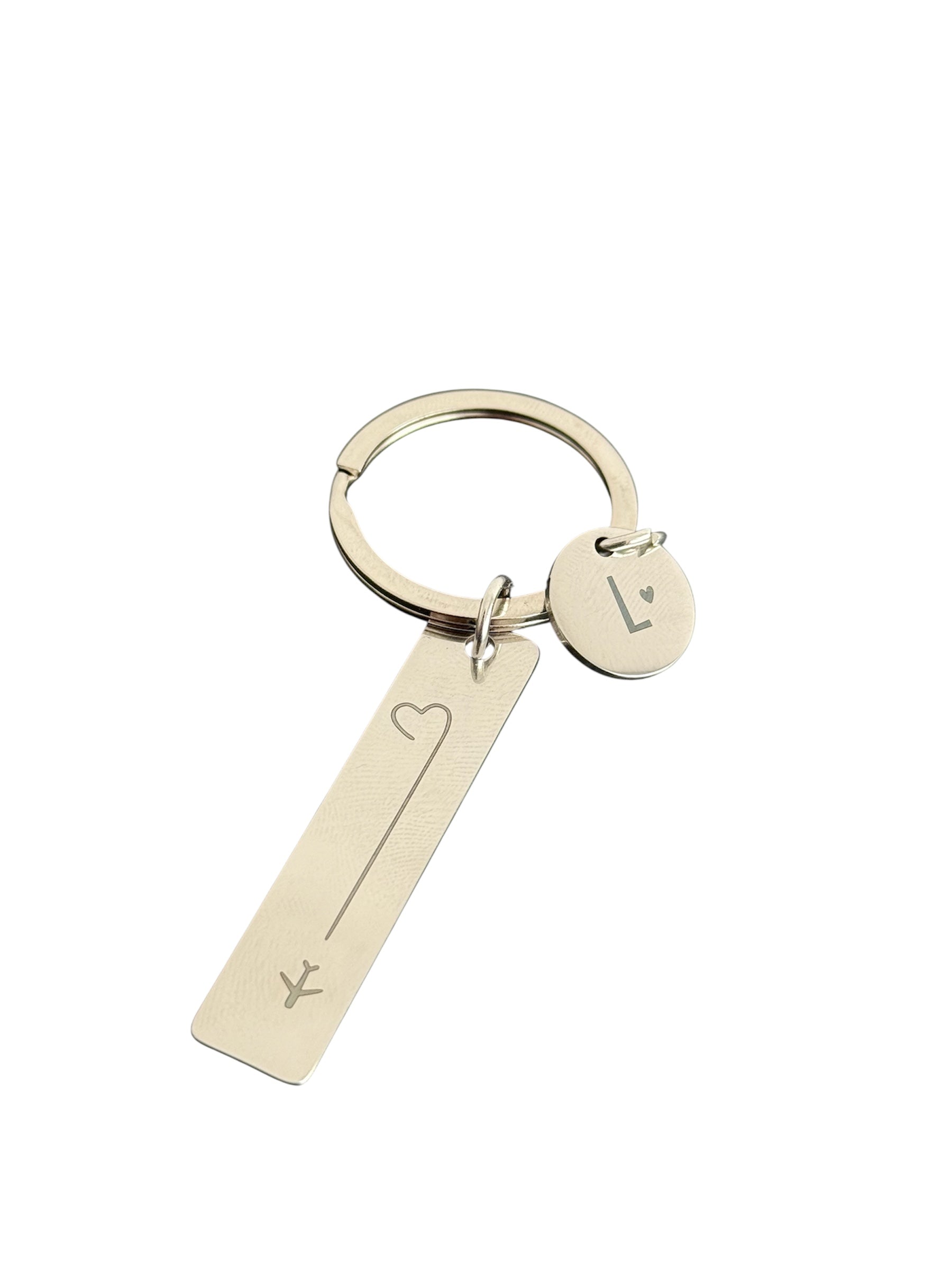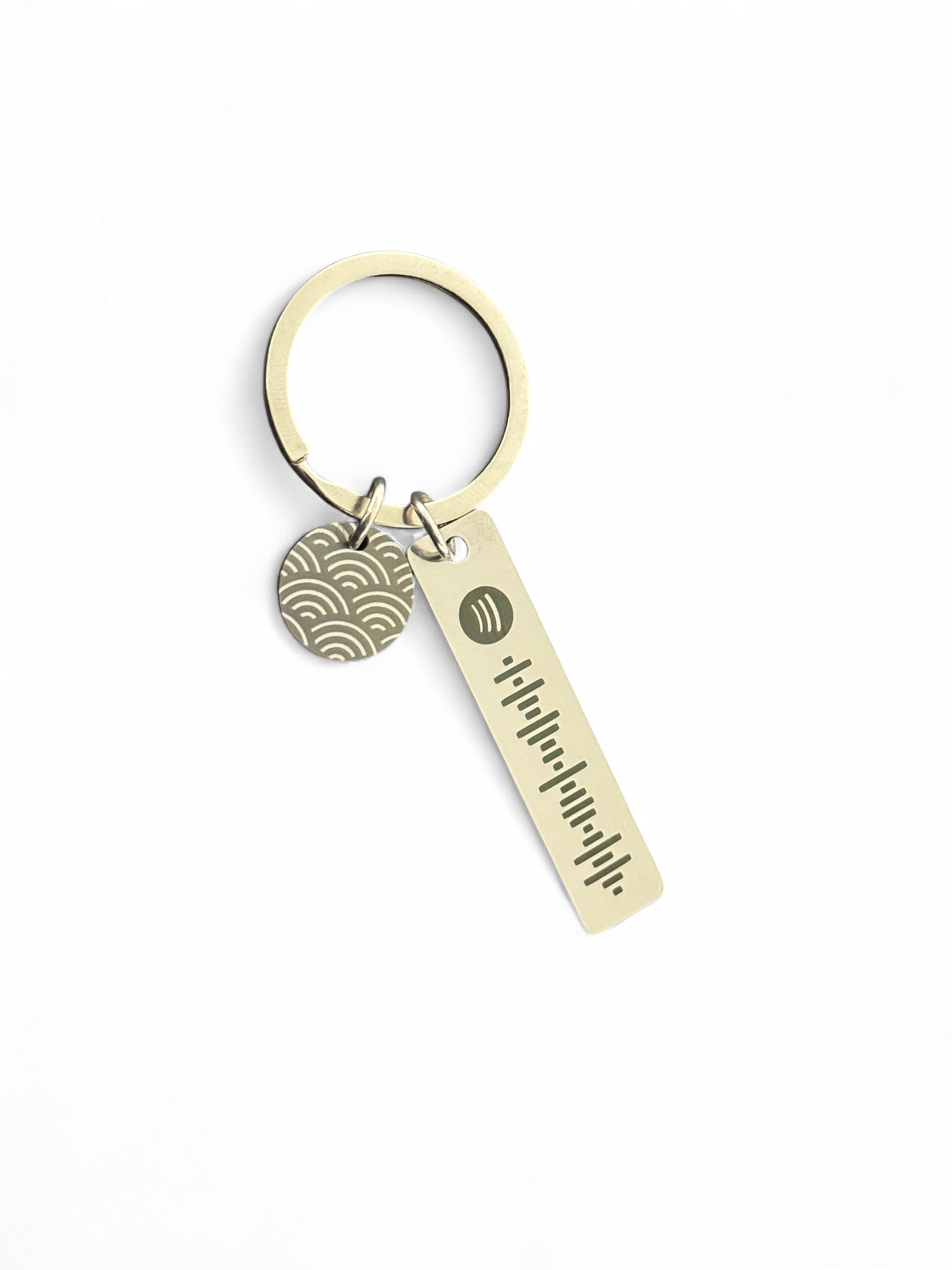 Llavero de acero inoxidable con placa rectangular vertical y dije circular, grabado a láser con la máxima precisión.