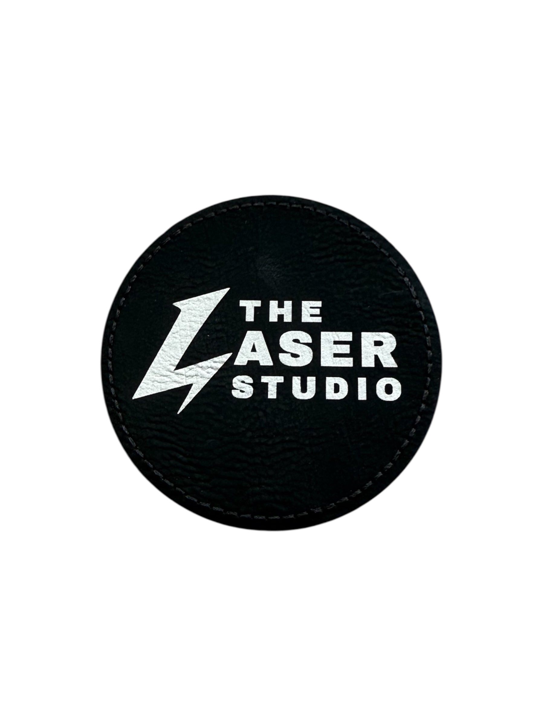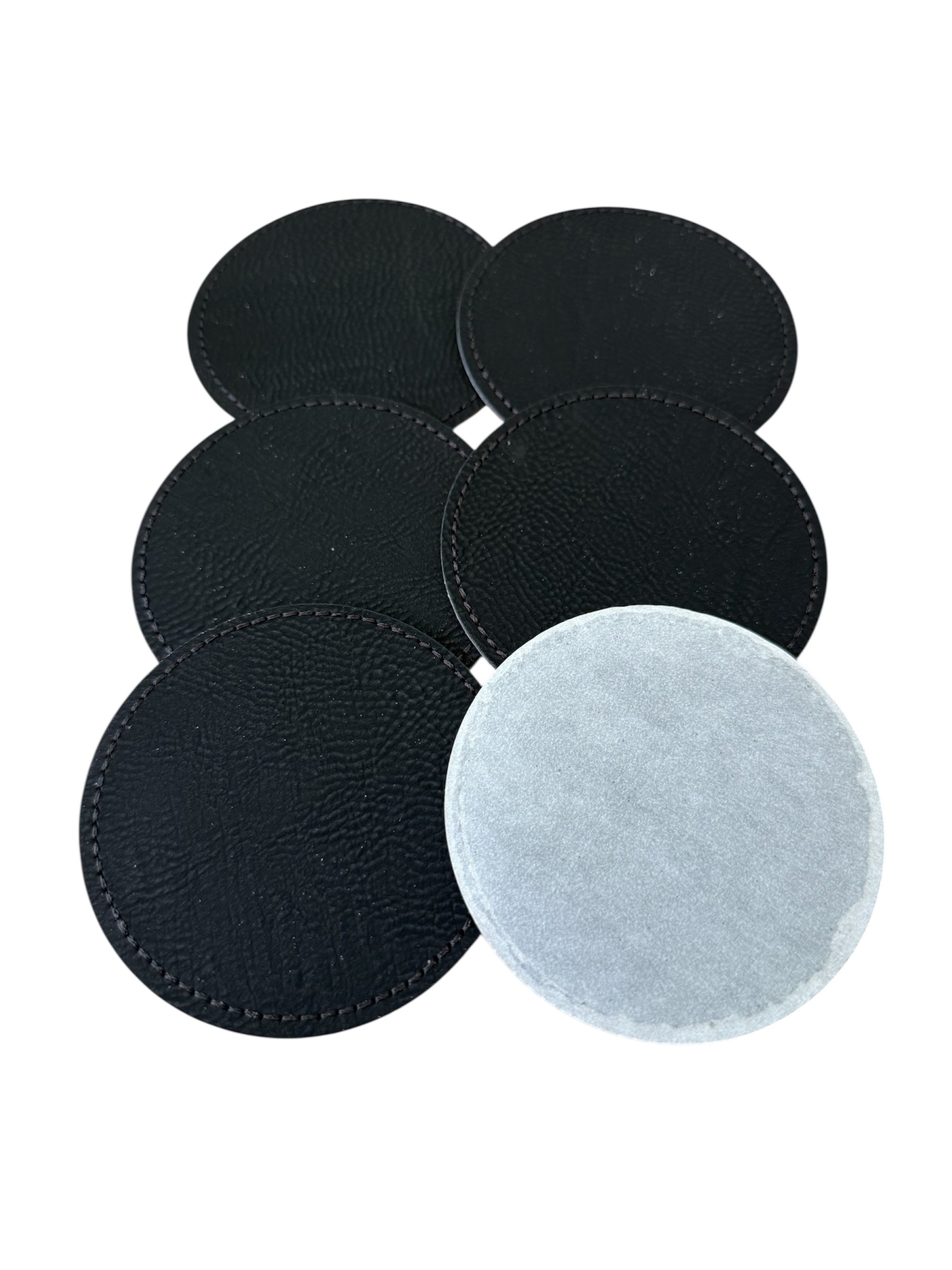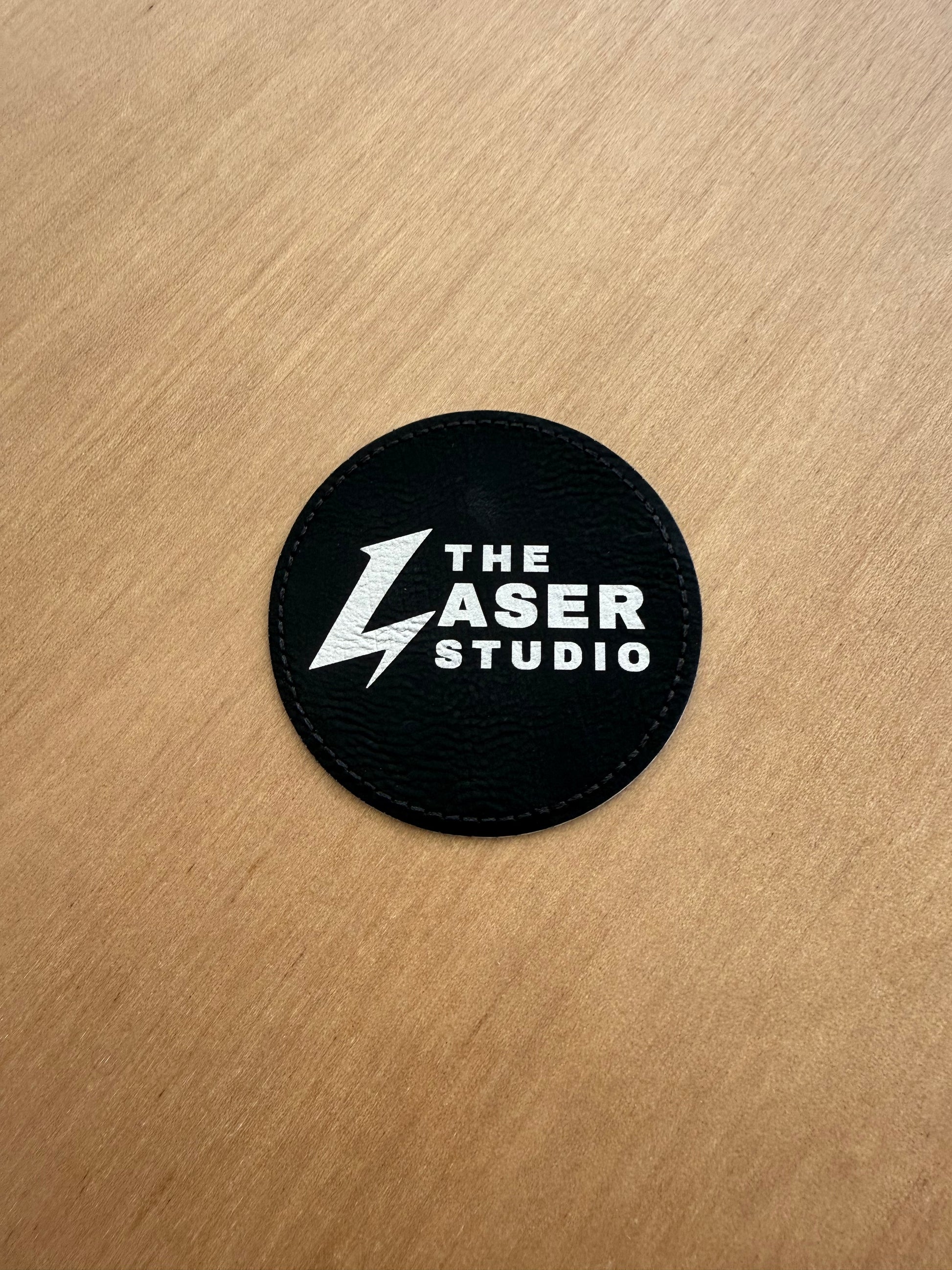 Parches circulares de cuero sintético negro, diseñados para grabado láser.