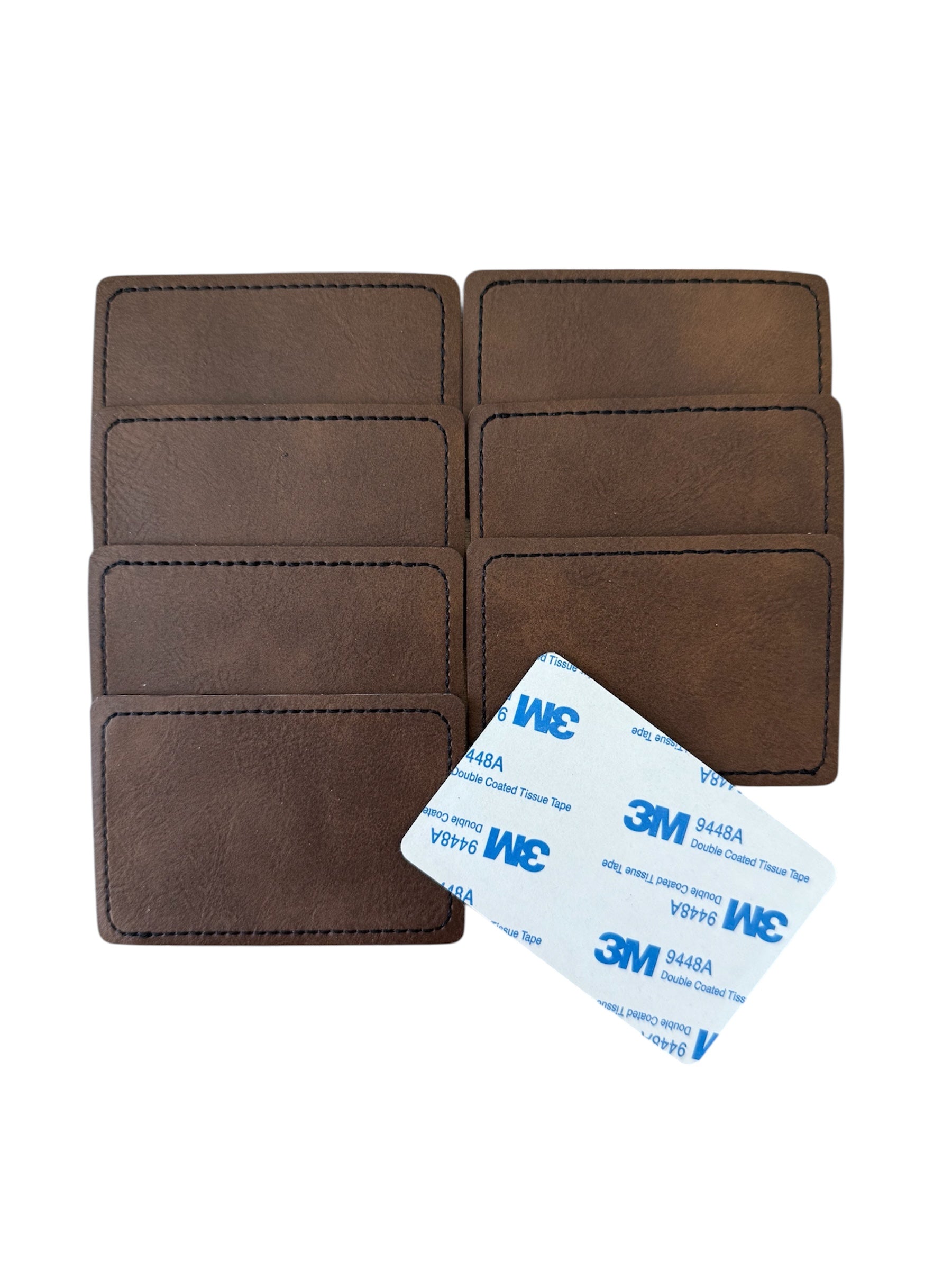 Parches sintéticos diseñados para grabado láser, que revelan un acabado plateado metálico sobre fondo marrón. Tienen adhesivo 3M para pegarlos donde mas te guste.